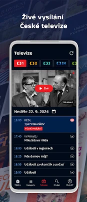 Sledujte obľúbené relácie cez jedinečné zobrazenie, ktoré imituje televízny program všetkých kanálov Českej televízie – od ČT1 a ČT2, cez spravodajskú ČT24, športovú ČT sport, až po detský kanál ČT : D a kultúrnu ČT art. K dispozícii sú aj všetky exkluzívne živé prenosy z iVysílání Plus a ČT sport Plus, čím získate prístup k obsahu, ktorý inde nenájdete. Ak viete, čo hľadáte, naše inteligentné vyhľadávanie vám umožní rýchlo a presne nájsť konkrétne programy, filmy či epizódy, šetriac váš čas a zaručujúc, že nikdy nepremeškate svoj obľúbený obsah.
